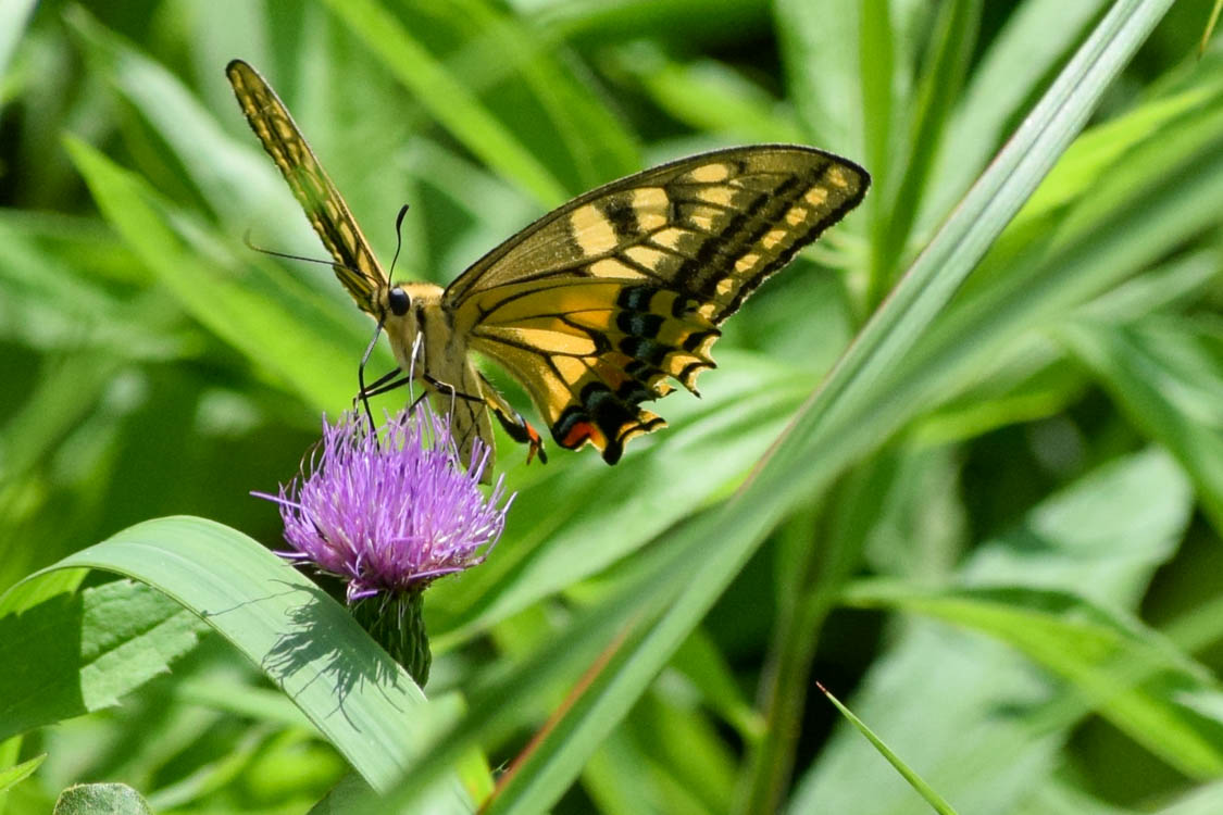 丘陵地から山地の草原でよく見られます。ナミアゲハに似ていますが、名前の通り黄色い色をしていることと、表から見ると前翅の付け根がナミアゲハがしま模様なのに対して、こちらは黒っぽくなっているため見分けることができます。