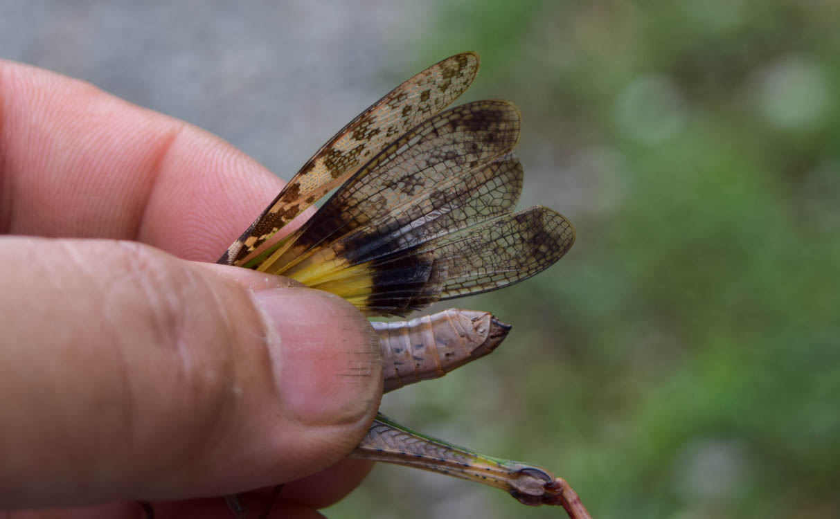 トノサマバッタとの違いは、目の下に三角形の黒い模様が入るのと、後翅(内側の翅)の付け根が黄色く、その外側に黒い帯模様が入ることです。