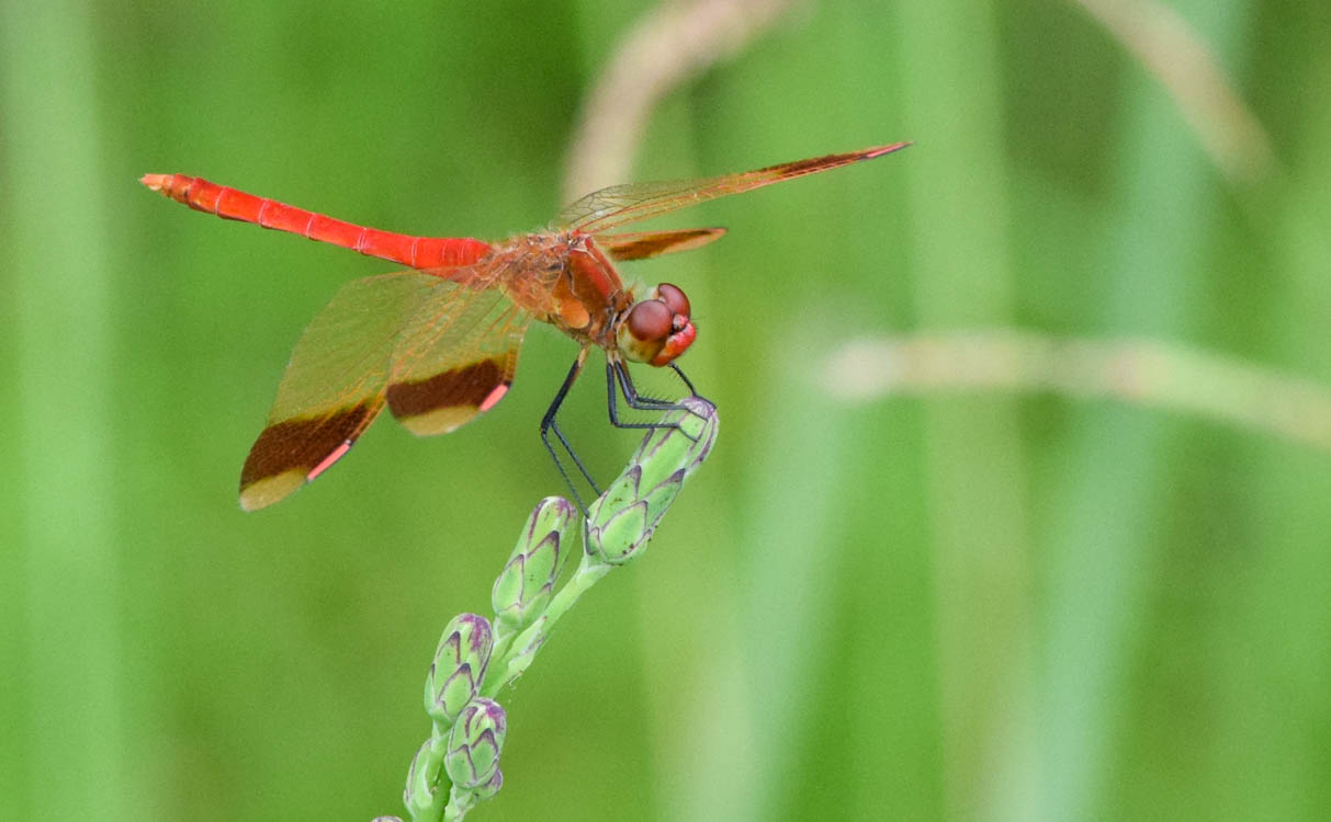 このトンボは、ほかの赤トンボと違って羽化直後から棚田にとどまるため、7月には羽化したばかりの未成熟個体が草むらなどでたくさん見られます。羽化直後の個体は非常に弱々しく、素手でも捕まえることができます。