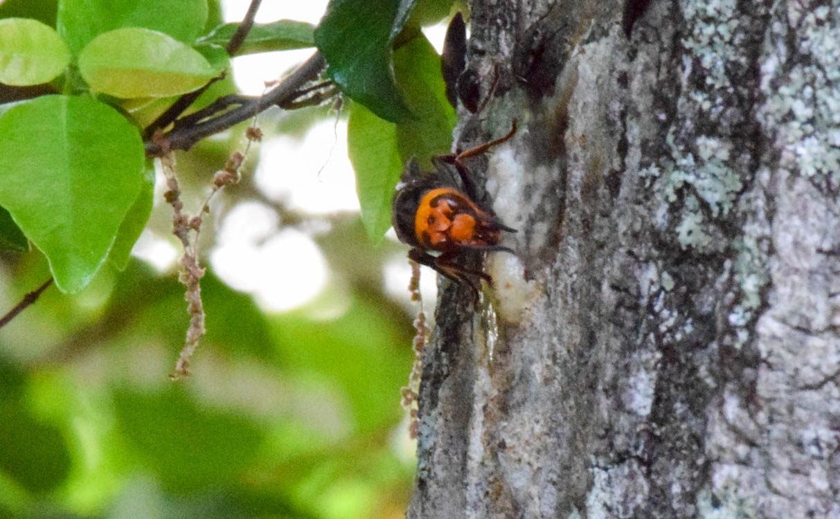チョウや甲虫類と一緒に木の樹液に集まっている姿をよく見かけますが、こういう場面のスズメバチはまず攻撃してこないのでさほど恐れる必要はありません。