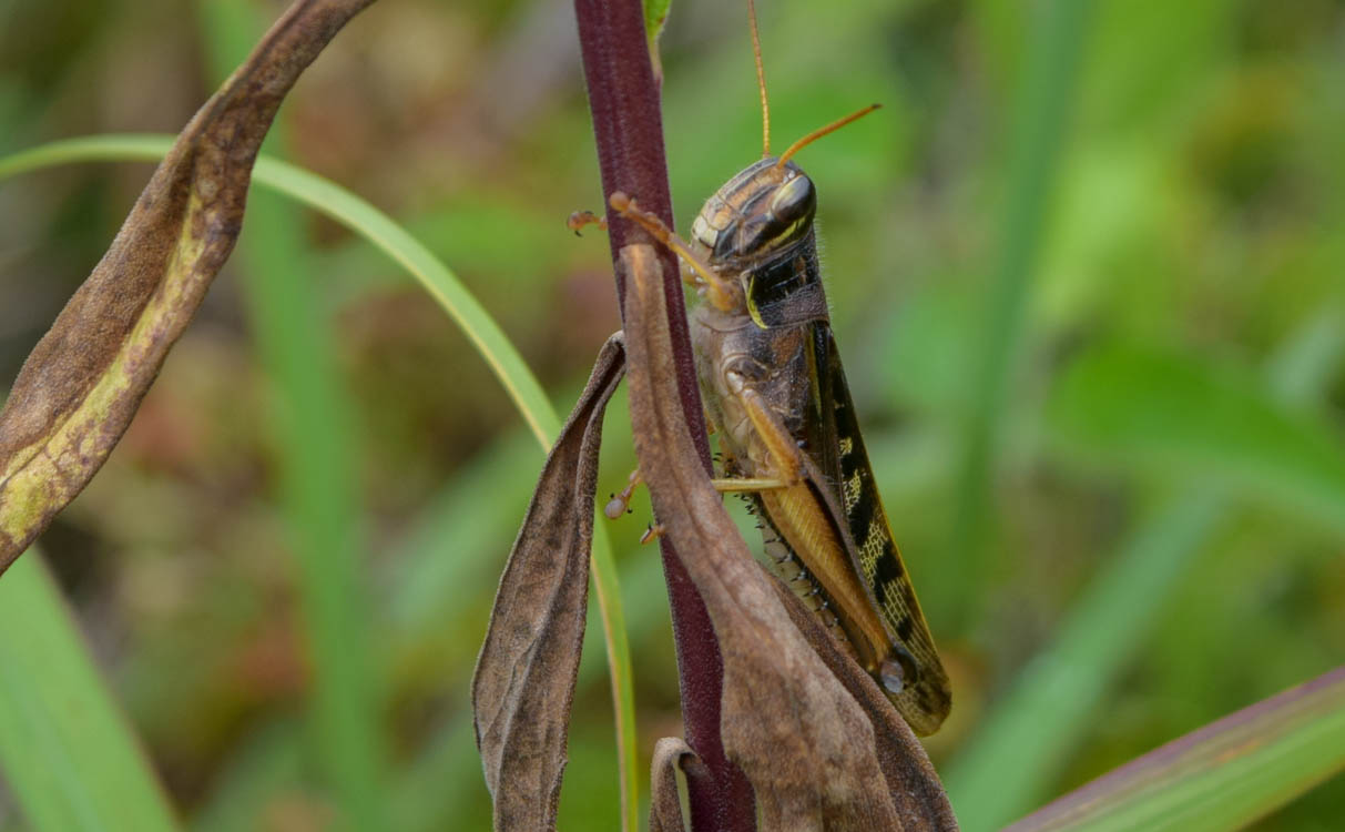 目の下の黒い涙のような模様が特徴で、「イナゴ=田んぼの害虫」と思われがちですが、このツチイナゴはクズの葉が好きなのでクズが繁茂する場所を探すと見つかることが多いです。