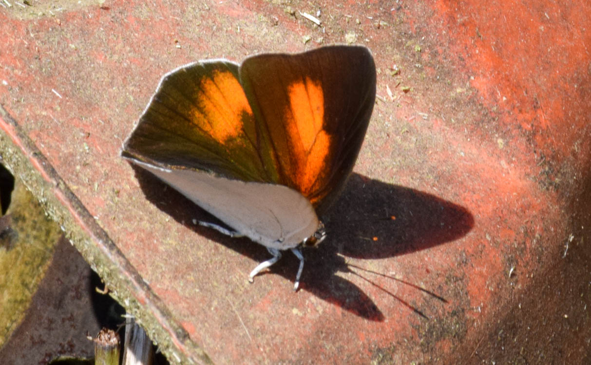 裏側とは対照的に翅の表側は茶色に鮮やかなオレンジのツートン、メスは茶色地に白のツートンです。